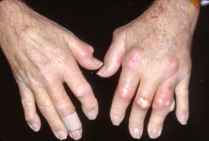 3.Setelah beberapa tahun, jika tidak diobati dapat ditemukan pembengkakan, kekakuan dan nyeri ringan sampai berat pada satu atau beberapa sendi setelah episode akut yang berulang-ulang.